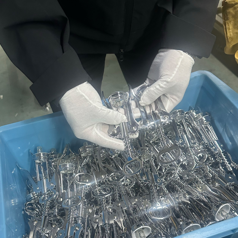 Los recubrimientos de todos los componentes del sacacorchos suelen utilizar métodos de galvanoplastia o pintura; para este ejemplo, nos centraremos en la galvanoplastia. El procesamiento de galvanoplastia lo completa un proveedor subcontratado, lo que requiere instalaciones, equipos e ingenieros industriales altamente especializados con años de experiencia en su campo, junto con numerosos técnicos básicos y trabajadores experimentados. Es un proceso muy complejo. Mantenemos una cooperación a largo plazo con proveedores que tienen 30 años de experiencia en la industria, lo que garantiza la estabilidad del producto. Esto también garantiza que los diversos problemas de producción que surgen durante la fabricación puedan abordarse de forma rápida, profesional y eficiente. Estos acuerdos ayudan a garantizar los ciclos de producción de artículos como accesorios para vino, utensilios de cocina y sacacorchos, al tiempo que respaldan los planes de ventas de los clientes.