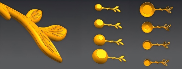 En primer lugar, implicó evaluar la forma del producto y su uso potencial en función de la experiencia previa. Utilizando una aleación de zinc como material principal, calculamos la densidad del material y las características de la superficie, incorporamos ergonomía y diseñamos las dimensiones generales para las cuatro cucharas medidoras o cucharas de hielo. Posteriormente, refinamos cada curva, los ángulos del radio R y otros detalles a pequeña escala basados en estas dimensiones.