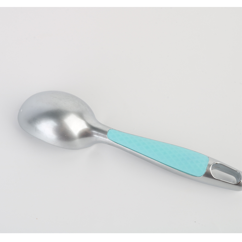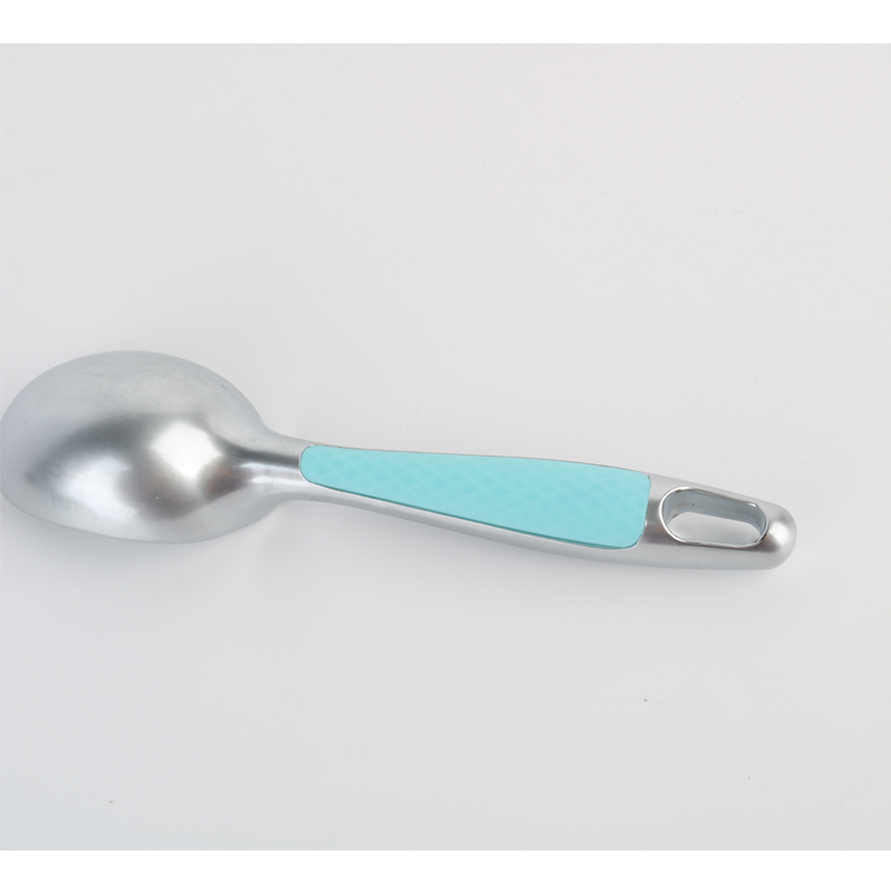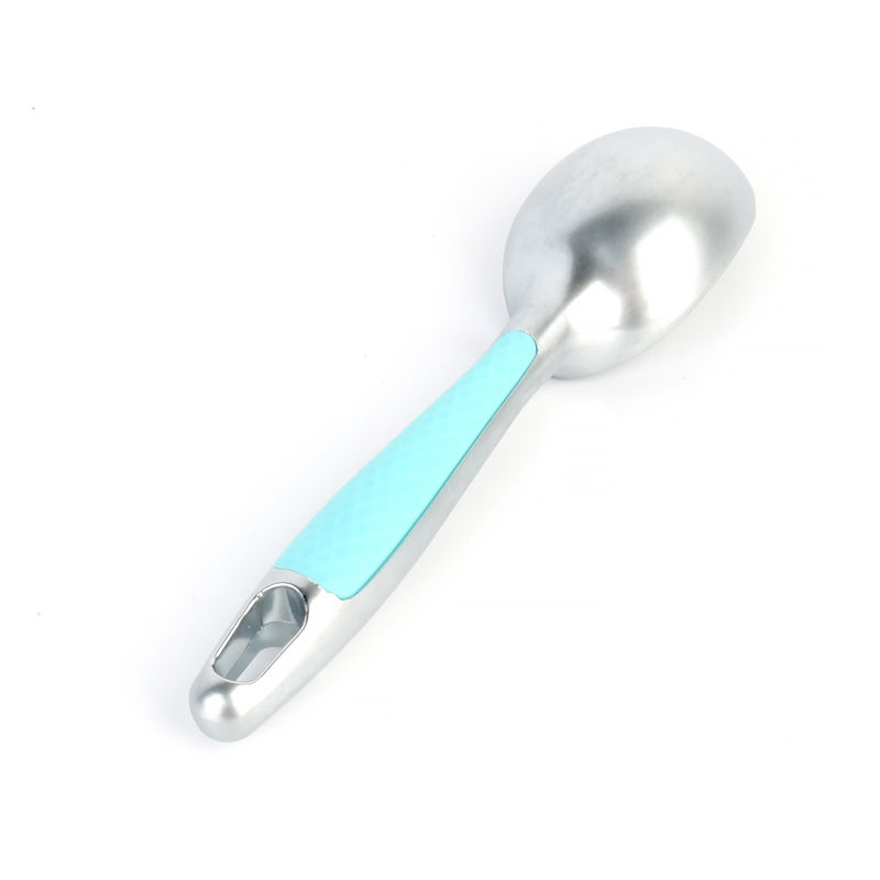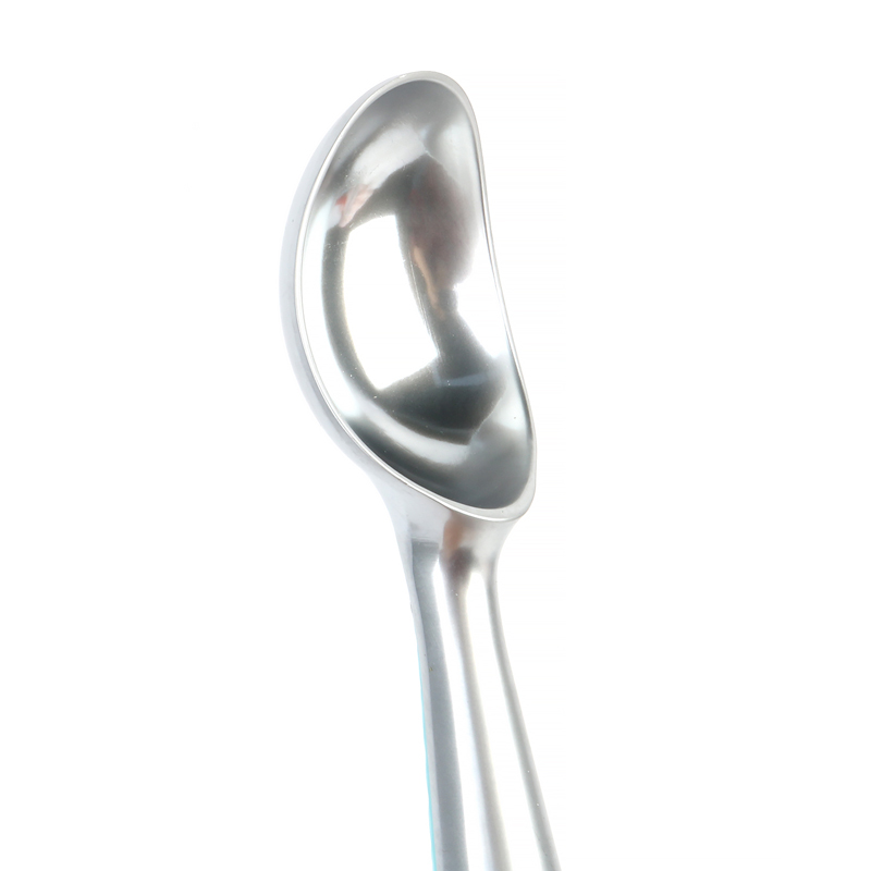 La cuchara para helado profesional de aleación de zinc con agarre cómodo, mango de plástico antideslizante, acolchado, único y apto para lavavajillas, está ubicado en el reverso del producto, diseñado específicamente para un agarre óptimo cuando se utiliza el agarre inverso de cuatro dedos. Como se muestra en las ilustraciones del producto, el mango incorpora un patrón de superficie texturizado que garantiza un manejo seguro y reduce la fatiga de la mano. Este diseño bien pensado no solo mejora la experiencia del usuario, sino que también demuestra nuestro compromiso de combinar practicidad con una artesanía elegante en cada detalle.
